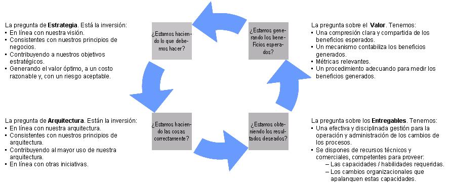 La siguiente figura muestra cuatro preguntas fundamentales que trata de responder la metodología Val IT.