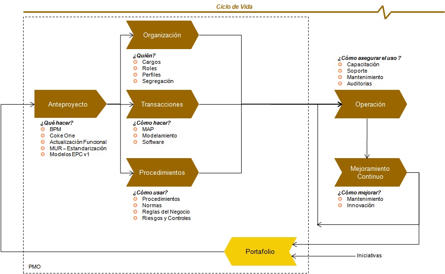 Este modelo está diseñado para proveer la base conceptual para ejecutar proyectos de implementación desde la perspectiva de los procesos de negocios basados en la disciplina Business Proocess Management (BPM). Como se podrá observar el modelo trata, al menos, las dimensiones: Organizacional, Procedimental y Transaccional del proceso.