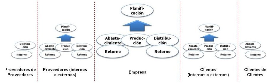 La siguiente figura muestra como se relacionan los procesos de la cadena de abastecimiento de una empresa, y a la vez como los procesos de ésta se relacionan con su entorno.