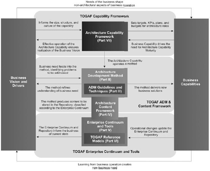 TOGAF se ha desarrollado y ha evolucionado continua mente desde mediados de los 90 bajo el alero del Open Group´s Archiecture Forum, actualmente este modelo va en su versión 9. A continuación incluyo el diagrama general de este modelo: