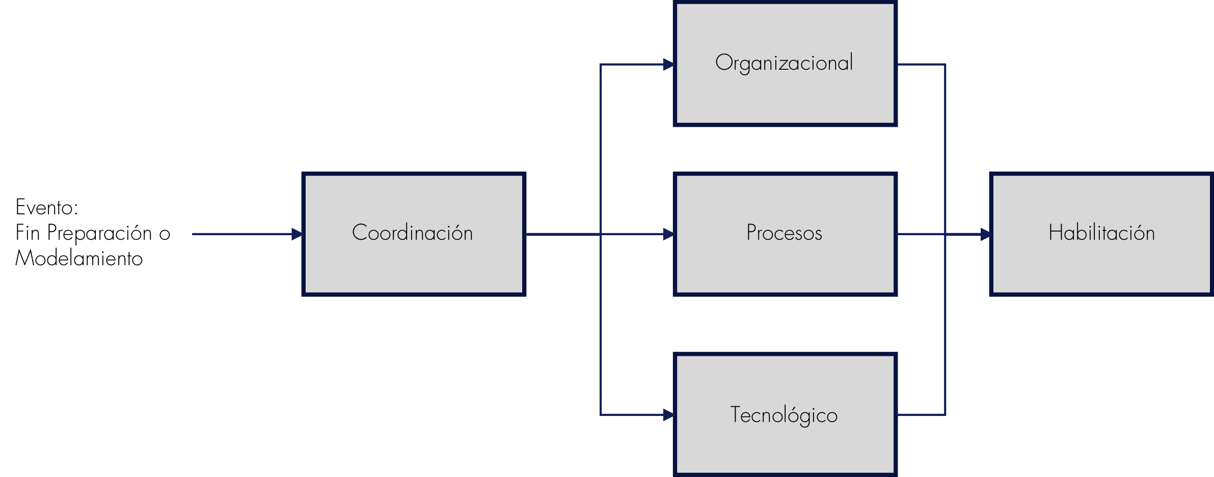 - Coordinación, trata que los equipos que corresponden a los ámbitos organizacional, Procesos y Tecnológicos se reúnan para analizar el conjunto de mejoramientos correspondientes al Proceso / Subproceso, y establezcan el alcance a implementar, las dependencias funcionales entre los tres ámbitos, los hitos de inicio y término por ámbito, y la estrategia para la Habilitación.
