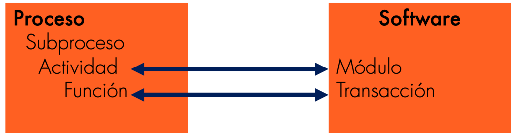 El método que propongo es muy simple y corresponde a un mapeo, que asume que los procesos de negocios ya están identificados e, idealmente, modelados, y que el ERP u otro ya están seleccionados. El gráfico siguiente señala los elementos a mapear.