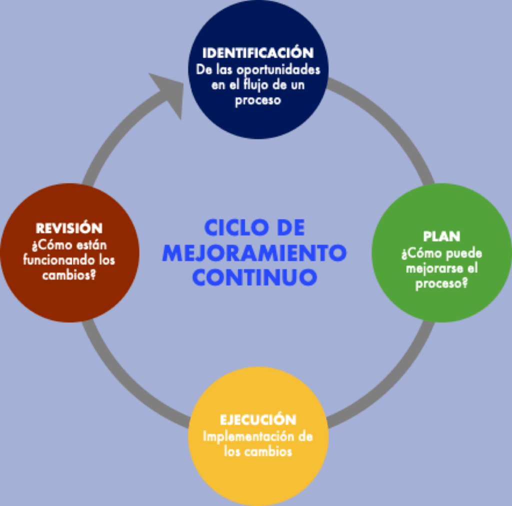 «Un cambio gradual y permanente que es enfocado en aumentar la eficacia y/o la eficiencia de una organización para cumplir con su política y objetivos. No se limita a iniciativas de calidad. La mejora en la estrategia comercial, los resultados comerciales, las relaciones con los clientes, los empleados y los proveedores pueden estar sujeta a mejoras continuas. En otras palabras, significa «mejorar todo el tiempo, en todo».