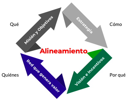 El diagrama ilustra que la Misión es sobre el  que lograr; la Red es sobre con quienes capturar el valor económico; la Estrategia trata sobre el cómo los recursos serán asignados para cumplir con la Misión en el contexto de la Red; y la Visión y los Incentivos se refiere al por qué los colaboradores están motivados a trabajar con un nivel alto de performance.