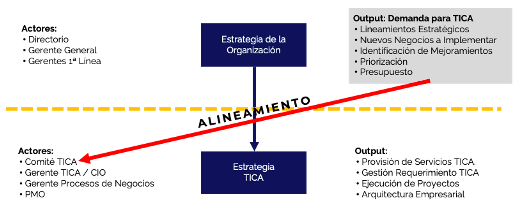 El Alineamiento entre el quehacer de TICA y el resto de la organización es vital para que la tecnología sea un real soporte en la generación de valor. Para ello es necesario: disponer de una instancia formal donde la Alta Dirección plantea sus necesidades de apoyo tecnológico digital, ojalá por escrito en la Declaración de Demanda. en esta instancia es imprescindible la participación del Gerente de TICA  (CIO)y del Gerente de Proceso (aunque este dependa del Gerente TICA